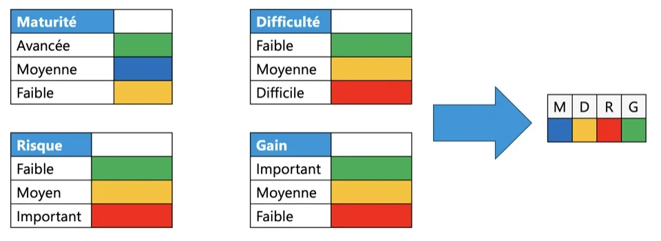 En évaluant ces 4 dimensions, on peut établir un ordre de priorité sur les actions, ainsi qu'une roadmap pour les mettre en place. Si une action est peu risquée avec une difficulté moyenne, nous pouvons la faire rapidement (Quick Wins) même si le gain est moyen.