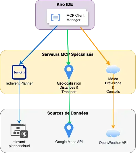 Kiro orchestre automatiquement les différents serveurs MCP pour fournir des réponses complètes et actionnables, transformant des requêtes complexes en plans d'action. L'IA analyse les contraintes multiples (temps, budget, préférences, disponibilités) pour proposer les meilleures solutions sans intervention manuelle.