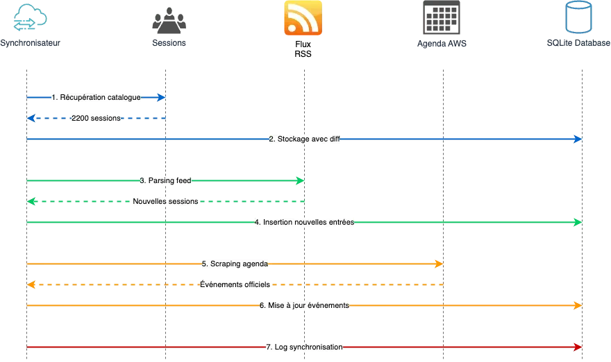 - Sources multiples : API officielle, flux RSS des mises à jour, agenda AWS des événements spéciaux